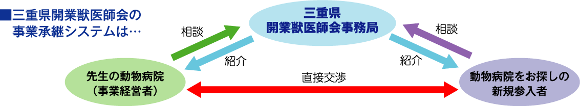 三重県開業獣医師会会員間独自のネットワークと、現役獣医師自らの手で事業承継する側、される側でできるだけ安くマッチングする事を考え、最適な候補先をご紹介致します。 その際には承継当事者同士での直接交渉で、承継の決まりはありません。例えば「家賃収入分だけ頂ければいい」とか自由な発想で交渉していただきます。